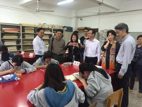 在实地参观后,委员们与校方领导面对面畅谈。莫愁中专校长杜迎新全面介绍了该校的发展状况:2001年,莫愁中专校在全国率先开办三年制中专古籍修复专业,使得原本“私相传授”的古籍修复技艺,与学校教育初步结合起来,成为这个领域真正意义上的拓荒者。15年来,该校的古籍修复专业已修复3000多件一级古籍,修复古籍总量达1万多册;培养学生近600名。据莫愁中专副校长章学军介绍,该校在教学实践中,还独创古籍修复“十八项技能”,制定了古籍修复中级工、高级工考核标准,填补了行业里的空白。2013年,该校开设的“文物修复与保护”五年制高职专业,打通升学瓶颈,让古籍修复专业学生可通过“专转本”升往晓庄学院和金陵科技学院就读二本汉语言文学专业。莫愁中专古籍修复中心主任王燕介绍了该校的专业设置情况,文物修复与保护专业增开云锦修复与制作、陶瓷修复与制作方向;在此基础上,南京非遗学院拟增加开设民族传统技艺、文化创意与设计等专业。