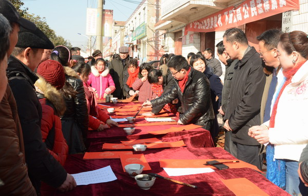 在社区主会场,挤满了闻讯赶来的群众。他们有的正在仔细挑选自己喜爱的春联;有的在一旁帮书画家们铺纸、压纸;有的在晒墨迹还未干透的春联。一副副洋溢着节日喜庆的春联一“出炉”,就被现场热情的居民“抢走”。在乡镇分会场,恰逢镇上集市,现场气氛更加热烈,一位刚拿到书画家为他书写的春联的老大爷喜笑颜开,他说:“很久没有见到手写的春联了,今天一出门就看到你们举办的义写春联活动,忽然感觉到消失的年味儿回来了。”