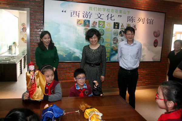 之后调研组一行又赴连云港市苍梧小学、连云港市朐山中学进行实地考察,深入了解全市“书香校园”建设情况。在苍梧小学,校长戴咏芳、副校长汪燕向调研组介绍了苍梧小学“书香校园”的建设情况。苍梧小学的校园里广泛设有图书角,让校园每个角落都有阅读。设立“教师写 · 学生吟”专栏,由老师写、学生读的方式推动学生的阅读兴趣。将“西游文化”与“国家课程”进行渗透与整合。分别在语文、美术、音乐、体育课上进行“赏西游”、“绘西游”“塑西游”、“唱西游”“演西游”、“玩西游”,激发学生阅读经典的热情。组建“苍梧小学小书虫”阅读社团,将每周一节阅读课排入课表,每周五组织全校学生轮流走进市图书馆等场馆。建立品牌活动“苍梧书坛”,以专题的形式定期开展教师读书活动。每年举办“幸福百日,见证成长”活动,给家长讲解怎样进行亲子阅读。开展“我和书籍有个约会”读书节系列活动,我的作品、书签制作、封面设计、戏剧表演尽显同学们出众的理解与想象,优秀作品苍梧书院收藏并发收藏证书。在连云港市朐山中学,校长夏兴善向调研组介绍了朐山中学在“书香校园”方面的发展情况。因为学校在孔望山下,学校始终以孔子语录为文化标识,学校在学生的早自习之前,精简时间给学生们进行阅读。同时加大学校教师的阅读量,在寒暑假为每位老师报销一本书籍的费用,并将阅读与教学紧密联系起来,推动教师的网上阅读。海州区教研室主任张才宝指出,当前在海州区普遍存在着教师自身阅读不足的情况,且在全民阅读推动之前区财政的重视力度不足,计划将来将海州区分为五个片区,集中资源优势推动海州区小学的书香校园建设。