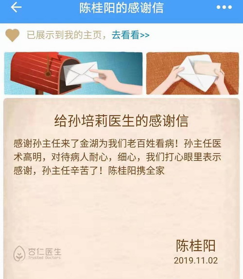 活动得到了江苏省人民医院多位专家的呼应与支持,一同赴金湖义诊的有心内科、呼吸科、内分泌科、脑外科、普外科、甲状腺外科、乳腺外科、胸心外科、口腔科、儿科、妇科等十几个科室的专家。钱卫冲副主委还特意准备了“《中国高血压指南》解读”的专题讲座,为当地100多名基层卫生人员授业解惑,将知识和多年的经验播撒在基层,力争惠及更多的人群、服务更多的百姓。所有参与者们用实际行动践行了医疗工作者的初心使命和责任担当。今年68岁的沈大妈对在家门口举办的这次义诊活动感到非常满意,她说:“我这呼吸系统的毛病得有10多年了,以前总想着去南京的大医院看病,可是年纪大了、路途又比较远,专家号更是一号难求。这次听说省人民医院的专家在中医院免费看病,我早早就上这儿等着了。”类似的称赞不绝于耳,大家都对这次活动感到满意。呼吸科孙培莉当场就收到了患者的感谢信。三个多小时的义诊活动,共为400多名患者提供了免费诊疗咨询服务。金湖电视台和金湖日报专门对此次活动进行了报道。