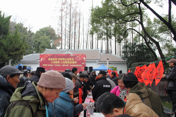书画家书写春联时,文艺团体的演员们送上了昆曲、弹词、舞蹈歌唱、小品器乐等节目。当《我和我的祖国》伴奏响起时,全体演员和在场的市民纷纷合唱,活动达到高潮。