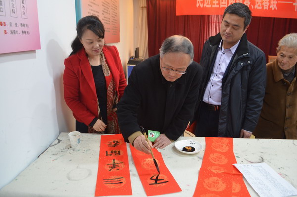 活动中,书画家们现场为当地群众挥毫沷墨,不吝笔墨书写下一幅幅充满吉祥寓义的春联和一张张喜庆的大“福”字,让当地的老百姓十分惊喜。拿到墨宝的人笑逐颜开,一位大爷开心的说:“写春联与买春联的感觉完全不同,现在的春联都是印刷版的,还是手写的好,散发着墨香,手写春联年味更浓,更有意义。”