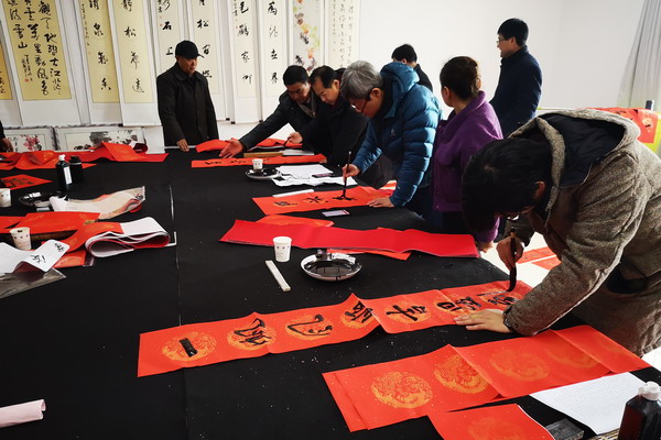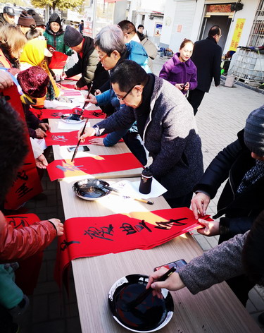 听说市里的书法家到镇上送春联,数百名村民早就在柳泉镇文化站门前热切等待。书法家们刚下车就开始伏案书写春联,他们挥毫泼墨、迷走龙蛇,沁人心脾的墨香,随着跳跃的笔锋在纸上浸润舒展开来。王德志副主委和随行的机关同志也拿起毛笔,向村民送上祝福。村民们争先恐后地挑选着春联,在拿到带着美好祝福的春联后,纷纷向书法家们表达感谢。一位村民高兴的说,“从市场购买印刷的春联,没有墨香味,今天拿到书法家们亲自手写的墨宝,真是太幸运了”。喜庆吉祥的春联,映红了人们的笑脸,装点了节日的氛围。活动从9点持续到12点,翟立新、华敬福、李一辰、陈巧令、张德峰、张禹等书法家共送出春联500余幅、福字300余张。