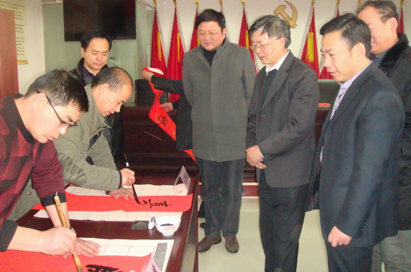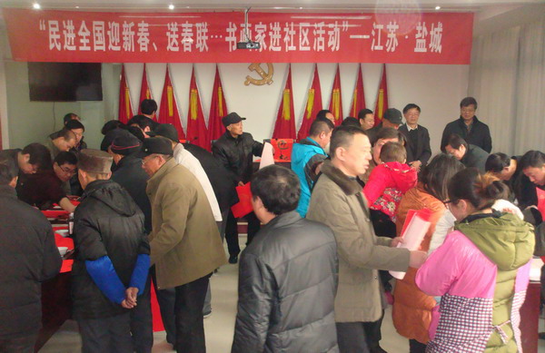 2月11日下午,亭湖新区南映社区居委会内人头攒动,暖意融融,由365体育官方app_0755 36553288_365体育论坛网址盐城市委与365体育官方app_0755 36553288_365体育论坛网址亭湖总支联合举办的“迎新春、送春联——书画家进社区活动”在此举行。盐城市政府副市长、365体育官方app_0755 36553288_365体育论坛网址市委主委马成志,亭湖区委统战部部长王林军、副部长仇道玉,区宗教局局长陈才国等应邀出席。365体育官方app_0755 36553288_365体育论坛网址市委副主委童骋、张永辉、张学军,副秘书长朱义刚参加活动。会员、书法家协会会员曹万峰、高中明,王宗年、张启平,刘群、夏一栋等六位书法家,并特邀盐城市书协主席郭列平,市文化馆副馆长吴洪春,飞捷企划公司董事长江从武等前来为社区居民免费撰写春联。
