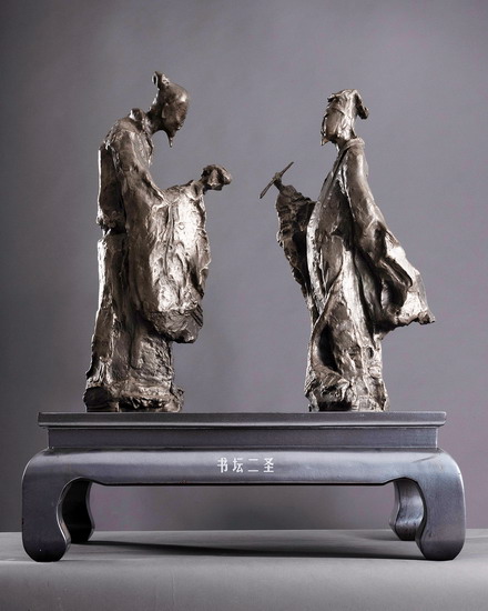雕塑作品《书坛二圣》材质为青铜着色,以传统文化之书法先贤典故“义之爱鹅”、“张旭脱帽”为创作素材,用写意技法进行创作,是跨时空的传承与对话。“羲之爱鹅”执笔点墨,形态为开;“张旭脱帽”收敛含蓄,其意为合,雕塑内涵符合中国书法中强调“外圆内方,阴阳开合”,体现传统文化的包容性,表现书以载道的精神。两个人物着色青灰石色、造型动态呼应,加之传统木底座,整体形似一座山石盘景,喻示文化基石长青。