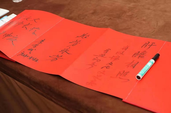 参观结束后,支部同志在纪念册上题字留言,党支部全体同志在吴贻芳先生雕塑前合影留念。