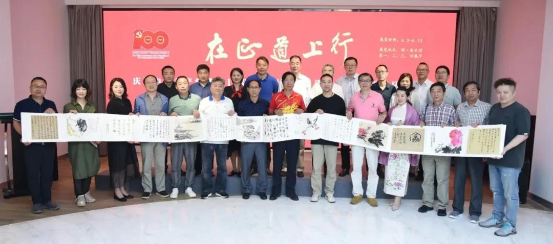 开幕式上,朱毅民向明·美术馆馆长杨辉赠送书画长卷《在正道上行》,出席开幕式的领导、嘉宾和书画家代表在长卷前合影留念。