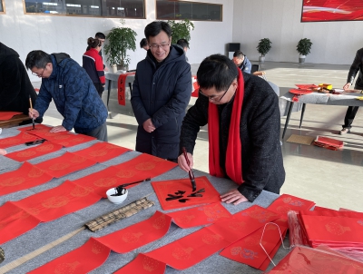 我会10多名书法家现场挥毫泼墨,笔走龙蛇,瞬间,一幅幅风格迥异、充满寓意吉祥美好的春联跃然纸上。公司员工拿着墨汁未干的对联,喜笑颜开,并与书法家们合影留念。每写好一幅对联,大家便小心翼翼地捧着放在地上,铺在桌上晾干墨汁。一副副红彤彤的对联连成一片,散发出浓烈的春节气息。据了解,本次活动现场共送出春联、福字共300余幅。